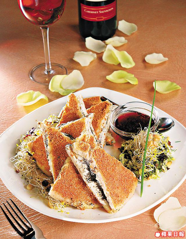 看似三文治,其實是大廚研究的新式比薩,先將皮焗至半熟,加入矜貴黑松露菌醬及芝士再焗,外脆內軟。加上自製的提子果醋及有機香草沙律,難怪於上屆食神爭霸戰憑此菜得到銀獎。