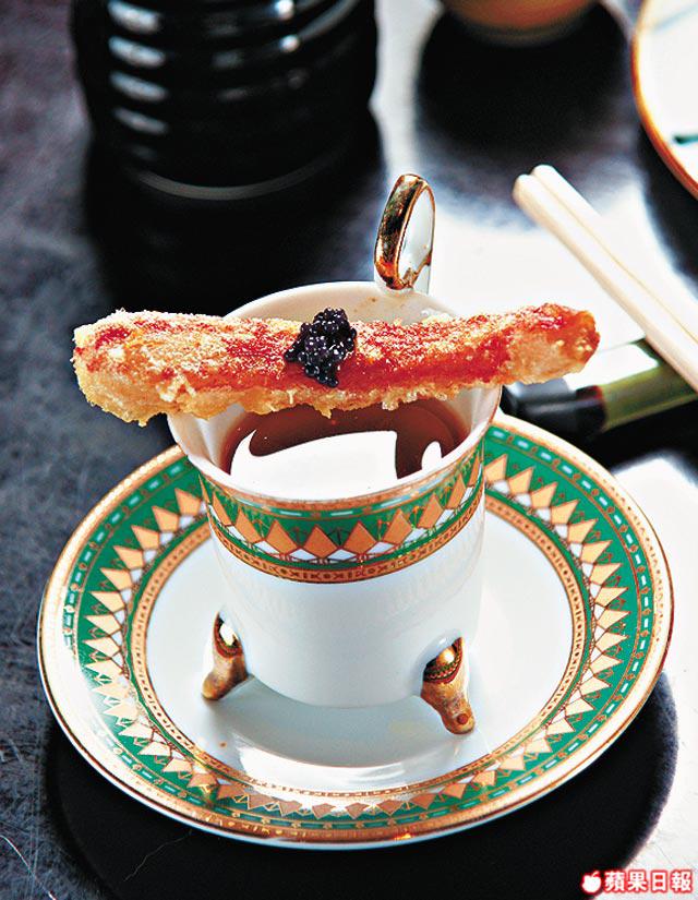 這道菜最特別是將北海道毛蟹加入橄欖油煮成香濃醬汁,熱醬汁伴點冰凉野菜,據悉是陳任最愛。