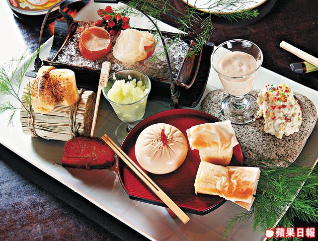 師傅自創這包羅6-8款的甜品集:龍珠果腐竹啫喱、苦瓜雪葩、白酒燴梨、芝麻豆腐等。有日式食材西式做法或西式材料日式煮法,筍!