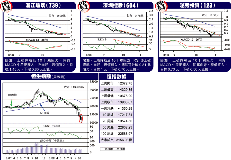 周線圖呈陽燭,錘頭,有初步見底之象,加上低位10676距大型頭頂最小量度跌幅目標10000點不過數百點之差,大市有機會在此覓得支持。另外,錘頭的下手影較長,亦顯示低位有一定購買力,推高大市。值得留意的是月線圖亦是有較長下手影的走勢,加上已持續下挫多時,累積跌幅驚人,預期將出現反彈,惟淡勢已成,反彈過後,可能還要再試底部,這樣的大周期,需時將較長。
