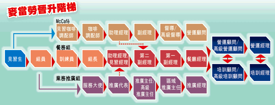 全港有超過200間麥當勞分店,員工多達1.2萬名,要在這個大企業中脫穎而出,鄭永楷說,上位全靠積極、合作、主動。「好似見到位婆婆想買嘢,你要主動啲問佢,了解佢想要啲乜!」除了主動了解客人需要,麥當勞很注重社會形象,所以若員工能做到關心客人,對升遷亦有一定幫助。