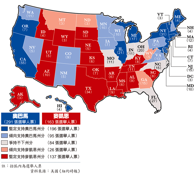 明天美國大選,全美逾2.3億選民可往票站投票,選舉心目中下任總統。但美國選總統不採取簡單多數制,不是那候選人贏得大多普選票就能當選。美國選總統採選舉人制,即某州選民投票後,候選人若贏得多數普選票,才能悉數獲得該州選舉人票。而每州選舉人票,跟該州國會參眾兩院議席數目相同,以體現聯邦和分權原則。美國參院100席、眾院435席,選舉人票基本上有535張,加上哥倫比亞行政特區的3張,總共538張,那位候選人贏得過半數270張,即當選總統。據《紐約時報》分析各州取向,奧巴馬已過270張選舉人票門檻,可成為美國史上首位黑人總統。