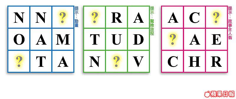 從九宮格中任何一個字母開始,從上下左右移動,但不可打鈄行,並填入餘下的兩個字母,組成一個完整單字。