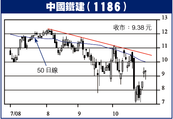 中國鐵建(1186)第三季毛利率較上半年縮減,但在原材料價格大幅下跌下,預期第四季毛利率會有改善。內地積極拓展基建項目,以保經濟增長,中鐵建將受惠此國策,首9個月新簽合同總額2,160.9億元人民幣,預期未來新簽合同總額會大幅上升,前景可看高一線。投資者可在9.10元吸納,中線目標10.70元,止蝕8.60元。