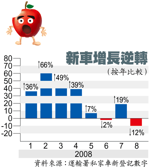 事實上,過去幾年股市暢旺,帶動咗汽車銷售急速膨脹,但呢個情況已經喺今年年中開始逆轉,八月新車登記數量按年開始出現雙位數字嘅跌幅。