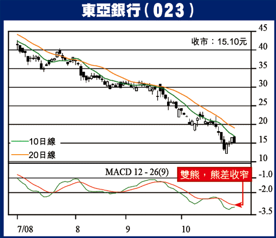 本地銀行股在今次反彈浪中,反彈力最弱,例如中銀香港(2388)近兩個交易日反彈乏力,東亞銀行(023)升近17元也乏力再升。東亞日線圖MACD雖然熊差收窄,但仍未發出熊牛訊號,恒指連續兩日企穩10日線,東亞卻連10日線也未能升破,弱勢得出奇,不宜視作炒落後對象。