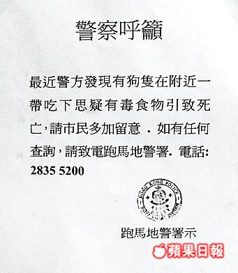 【本報訊】半山布力徑毒狗殺手再度出沒,上周二有市民帶領一頭拉布拉多犬到上址散步時,犬隻吃下毒餌身亡,令毒狗案再添寃魂。愛護動物協會譴責兇徒暴行,重申會方發出的16萬元懸紅仍然生效,狗主們則希望警方盡快破案。 記者:關英傑 劉柏麟