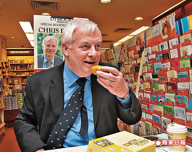 簽名會期間有記者指肥彭身形纖瘦了,肥彭好受落仲笑住話:「NotslimlyasIshouldbe(我應該再瘦啲).」但當收到外籍女fans送上佢最飛佛嘅泰昌蛋撻時,即時又忍唔住連食兩件。我哋嘅曾特首有議員怒掟請食蕉,前港督肥彭卸任咁多年,都仲有fans捧場同請食撻,唔知煲呔會唔會呷醋呢?