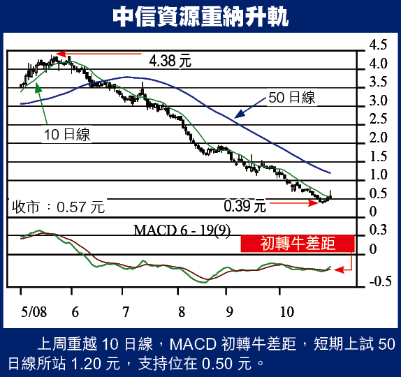 中信資源上周五突見神勇,高開1格後直上0.72元,大升36%,與大市向下調整之勢背馳,以勁如炮彈形容絕非過份,其後雖回跌至0.57元收市,比周四仍逆市漲7%,成交增26%,MACD牛差距開始擴闊,配合重越10日線強勢表現,短期可挑戰1元大關,預期升幅達75%!