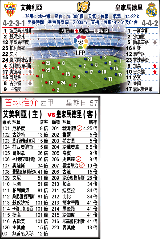 艾美利亞上季主場2:0勝皇家馬德里?今年肯定再無呢支歌仔唱。周日兩軍在同一個地中海球場交手,就算主隊有首席射手尼格度停賽復出,卻難演去季翻版。皇馬同樣有雲尼斯達萊復出,1.55倍W放心捧,再揀0:3波膽。(球賽編號:星期日57;有線14、61及64台明日2:00am直播)畢傑
