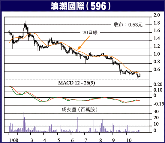 上周五跌市,上升正股超過550隻,股民信心似乎開始返嚟,頭50大上升股升幅起碼都20%,只要大市升浪再起,股仔將會輪到。浪潮國際(596)收市競價盤高收0.53元,升5仙,升幅10.4%。佢由電腦元器件貿易公司全面轉型為IT服務供應商,非常成功,且已進入收成期,股價在今年2月曾高見1.90元,受國際金融海嘯大形勢拖累而大幅回落,正係趁低吸納的大好機會。