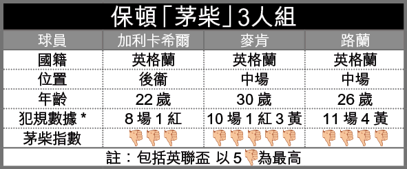 保頓在過去10場英超領了19黃1紅,並以22分於「茅柴榜」排第4位(未計上周六賽果),說到他們的「茅柴」代表,首推麥肯及路蘭。司職防中的麥肯作為第一防線,粗野攔截更是不可或缺,他今季才不過踢9場英超,已領了3黃1紅。