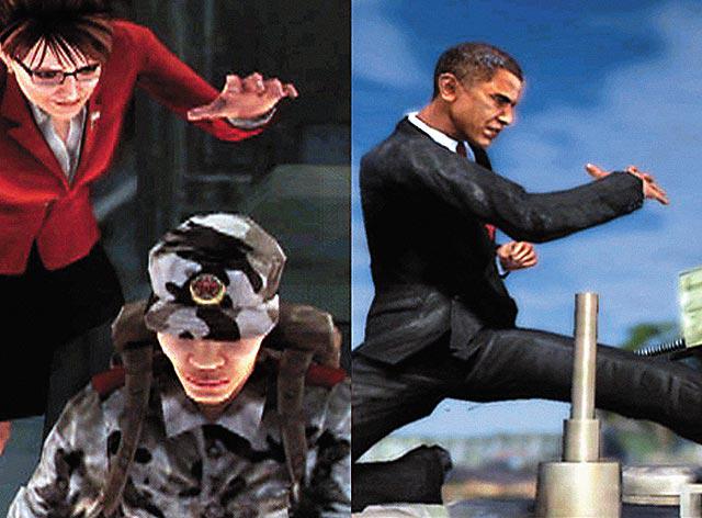 奧巴馬向坦克車擲手榴彈、佩林向安慰她的男人摑耳光?這是電玩遊戲Mercenaries2稍後推出的下載版內容。玩家可任選一人做打手(圖),在遊戲內偷坦克車、殺平民、炸直升機,據說奧巴馬騎劫軍車後會沾沾自喜,佩林射殺看門狗後會一臉滿足。