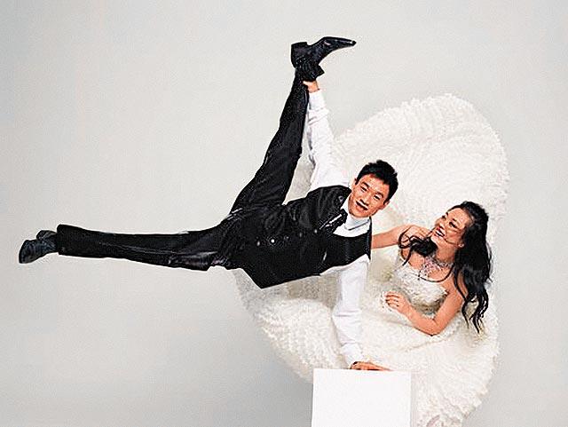 北京奧運體操「全能王」楊威與前體操運動員楊雲,周四將在海南三亞市的天涯海角景區舉行婚禮,一對新人的婚照近日曝光。「楊楊」的婚照,果然與眾不同,體操味十足。照片中,楊雲一時足尖繃緊,站在楊威大腿上,一時輕紗擺動翩翩起舞;身為奧運金牌得主的楊威亦不遑多讓,即使穿起禮服,也能擺出高難度的體操動作。互聯網
