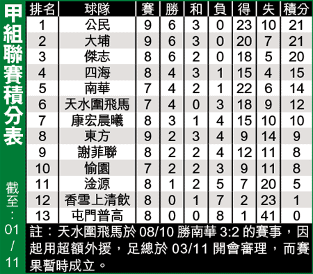 【本報訊】傑志昨午在旺角球場上演的甲組聯賽前列大戰,以1:1迫和大埔,兩隊雖繼續不敗,但同告失分後,令聯賽爭標形勢變得更為緊湊;前列3強暫時只差1分,加上緊隨的四海及南華,相信今屆聯賽王者之爭有排鬥。