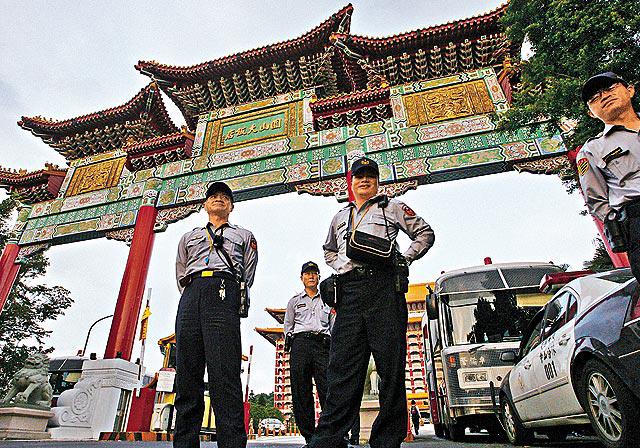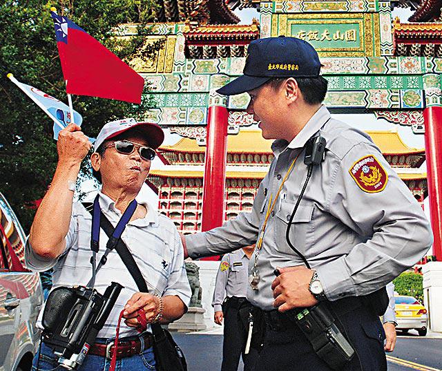 多名台灣民眾昨日帶備青天白日滿地紅旗前往圓山飯店,準備抗議。在場警員如臨大敵,並勸告民眾不要揮動旗幟,以免引發衝突,受到質疑。不過有男子雖然手中沒旗,但他將旗幟釘在帽子上,更加在紅色部份用膠紙加貼五顆紅星及孫中山頭像。