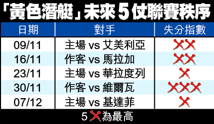 適逢英超的利物浦及西甲的華倫西亞齊齊在今周輸波,使維拉利爾成為4大聯賽入面唯一不敗之師。「黃色潛艇」何時被擊沉大海?以他們下5仗聯賽秩序來看,對手全為馬拉加、維爾瓦及基達菲等下游分子,「破身」可能性未算太大。然而,這5場過後,維拉利爾將面對魔鬼賽程,因連續4周要硬撼西維爾、巴塞隆拿、皇家馬德里及華倫西亞。