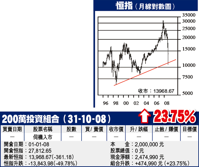 從月線圖(對數圖)看,恒指守住98年至今的升軌,10月雖是大陰燭,惟下影線頗長,反映承接力開始出現,短期可望延續反彈。不過,恒指已向下撐開月線圖保歷加通道底,且跌破50月線,而10月線又下破20月線,中長線走勢仍未許樂觀,反彈過後有機會再度尋底。