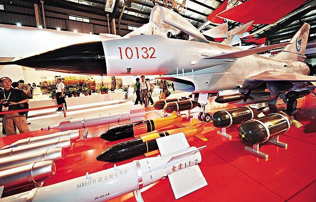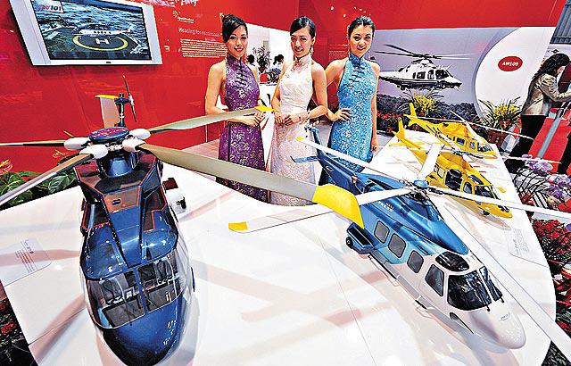 第七屆中國國際航空航太博覽會昨日在珠海開幕,內地自行研製的殲10戰機成為焦點,在場館內放置仿真的戰機模型(左圖)。展場其他新產品,包括生產商展出的直升機模型(右圖)。