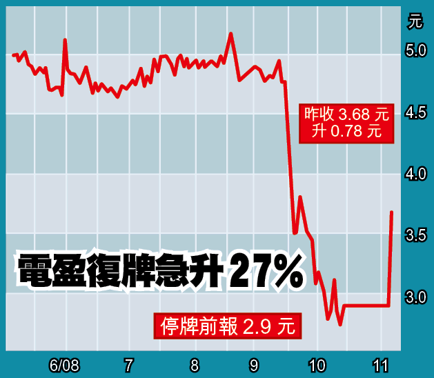來自投資銀行的消息透露,電盈最快12月底前召開股東會,就私有化建議投票表決。電盈昨復牌後股價隨大市上揚,收報3.68元,升27%。