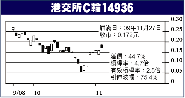 ■國壽C輪15342收0.47元,升0.085元,成交240球。此輪09年8月28日期滿,行使價28元,溢價51%,槓桿率4.6倍,有效2.4倍,引伸波幅86.5%,街貨1.92%。正股見25元,此輪理論價0.66元,升40%。
