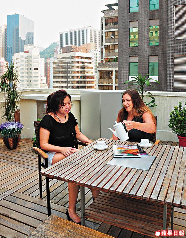 穿過一道重重的逃生門,眼前竟是個花園。要不是遠遠的中環中心和四周密密麻麻的商廈,我會以為自己身處郊外。「我就是被這天台吸引,明明灣仔應該好噪好繁忙,但置身這裏好寧靜。」但因為實在太殘舊,單純花在防水工作已花十萬,值得嗎?當大家坐在鋪上了防水室外木板的天台花園上,喝着茶,頓悉鬧市一樣可有桃源感!