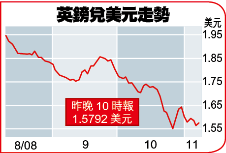 英國公佈減息1厘半後,市場反應正面。不過英鎊最終仍未抵住投資者的「風險厭惡」(riskaversion)情緒,美股於尾市跌幅擴大,英鎊跌勢亦告轉急。現時市場人心虛怯,股市有任何風吹草動,便會直接反映在滙價之上──股市跌則日圓美元升,歐幣及商品貨幣受壓;反之亦然。因此,現時在滙市開盤,必須留意股市的一舉一動。