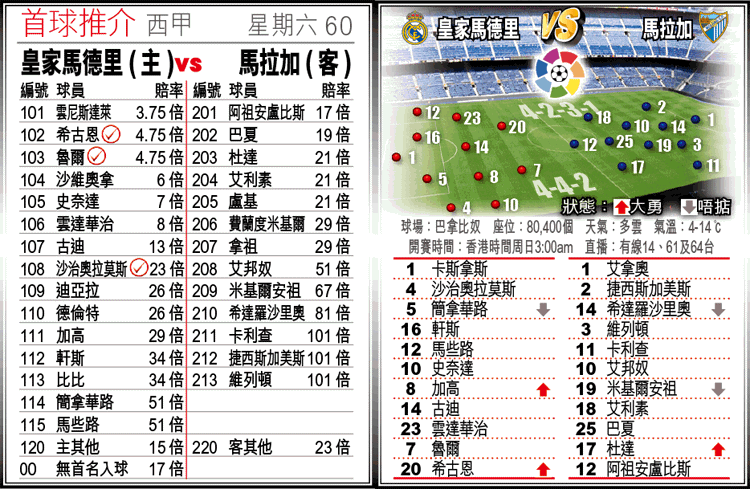 無疑皇家馬德里剛於歐聯被祖雲達斯技術性擊倒,但教練蘇斯達賽前稱已忘掉該仗傷痛;奈何連續10場失波的防線,周六迎擊馬拉加捧[-1]的「主勝」有危機,寧吼小勝開「和」。(球賽編號:星期六60;有線14、61及64台明日3:00am直播)