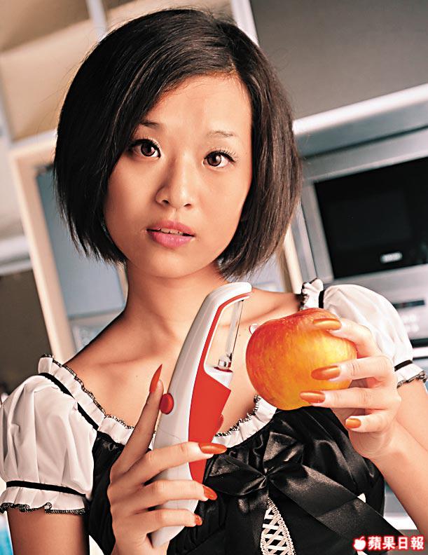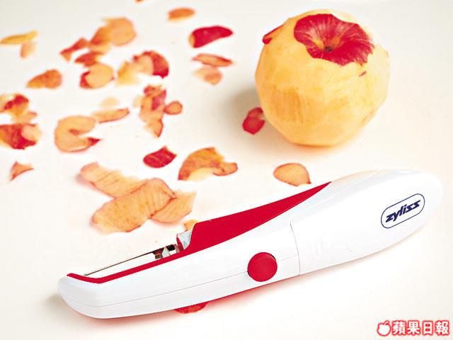 按動削皮器後將其放於蘋果上,慢慢轉動蘋果讓器材自動削皮。由於首次使用,削出的皮雖薄,但感覺不慣,故反而費時!但意念新穎,如擁有機械人女僕。