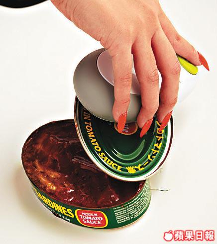 先將罐頭刀放罐頭上,一按掣,罐頭刀便會自動沿罐頭形狀而轉動,用家可不用手按。數十秒後,自動轉動一圈,罐頭刀則以磁石吸起罐頭蓋,安全方便。