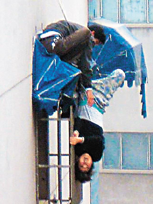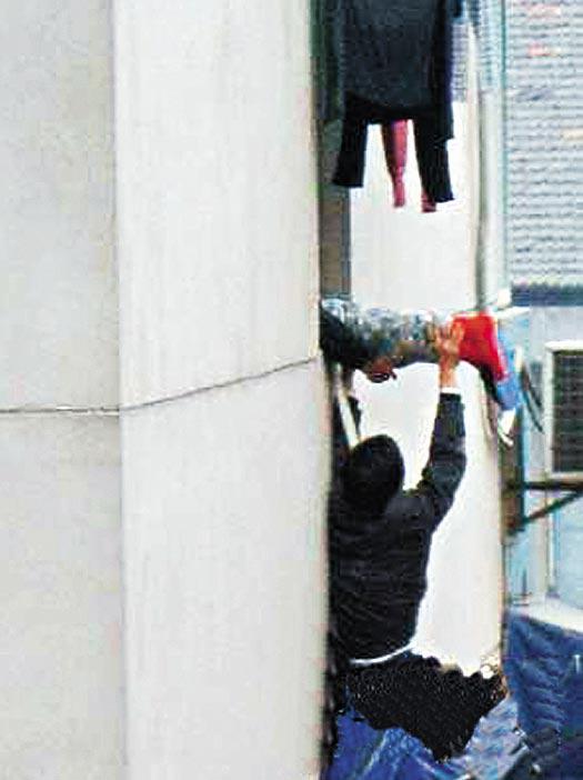 而6樓陽台上,老太太家人也着急萬分,他們一開始想站在窗前伸手將她拉回,但雨篷距陽台約有三、四米,根本拉不到;二來其左腿掛在雨篷上,身體倒掛空中,頭手都朝下,如只抓住右腿將她拉回,萬一失手後果將不堪設想。