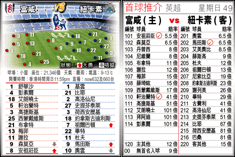 富咸情況剛好與紐記相反,近8仗只曾一勝,但於主場表現卻踢高幾皮,季初就曾擊敗阿仙奴。另外,前鋒安祖莊臣亦復勇,前仗梅開二度,夥拍森莫亞亦見合拍,加上後備殺手丹普西,不難勝出一仗。