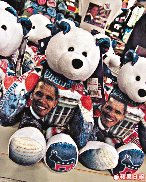 街上Obama頭的產品還不很多,最得意算是他的熊BearBear,搵歷史上首位黑人美國總統陪瞓,很危險的思想!另外有四款T-shirt及環保袋,應該會越出越多吧。倒是網上訂購火得很,CNN先搶閘推出Obama「Obamainspireshistoricvictory」T-shirt,廣告4號推出,每件約116美元,官方話24小時內已經賣出5,000件。Obama的支持者更在自己Blog上出售自己設計的ObamaBB蛤乸衣,拿拿臨上eBay睇,關於11月5日的剪報已經好多,不過渣一聲以大約20美元成交,最貴是8月份一張辯論會入場券,叫價202.52美元,一本Obama寫的《TheAudacityofHope》連簽名,叫價811.1美元,我10分鐘前睇還是750美元咋……我已經拿拿臨叫同事剪晒啲Obama報紙畀我,趁機賺外滙!