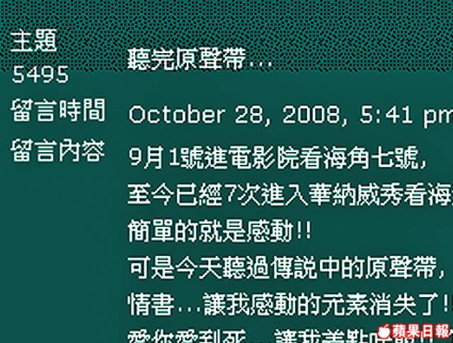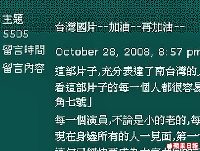 初采umi:久違了的感動,很久沒有看到電影院造成滿滿的情形,的確是一部充滿台灣人情味的國片!(轉載自《海七》官網留言版 http://cape7.pixnet.net/blog)