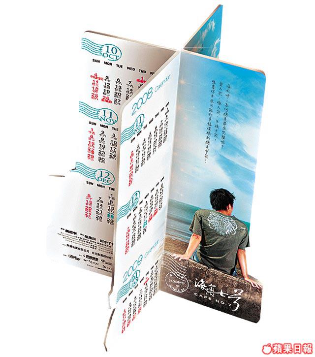 《海角七號》11月20日正式在港上映,大家要做好防「台」風準備。由即日起到各大戲院預訂《海七》戲飛兩張,即送座枱月曆一個,小記見過真身,製作認真,月曆內更有多張從未曝光劇照及情書金句,雖然有點阿Q,但若你是《海七》迷,每日望住小范同田中過2009年,個心自然甜到漏!