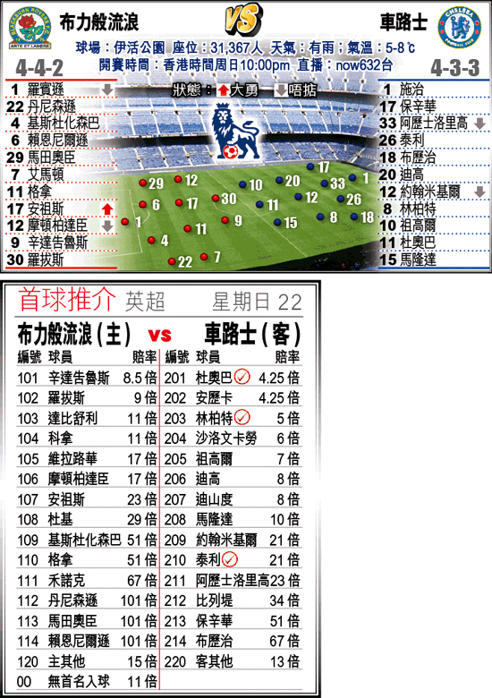 布力般近況平平,近5仗只得3和2負,雖然巴拉圭前鋒辛達告魯斯復出,上仗入球功臣之一麥卡菲,更領紅牌今仗停賽,攻力未有大改善;加上布力般今季之前主場兩遇阿仙奴及曼聯,不單全輸更合共失6球。領隊恩斯似乎面對強隊沒有法寶,不復以往布力般遇強越強的威力;相信今仗3分全失外,更隨時換來多一次大敗。文:牽牛