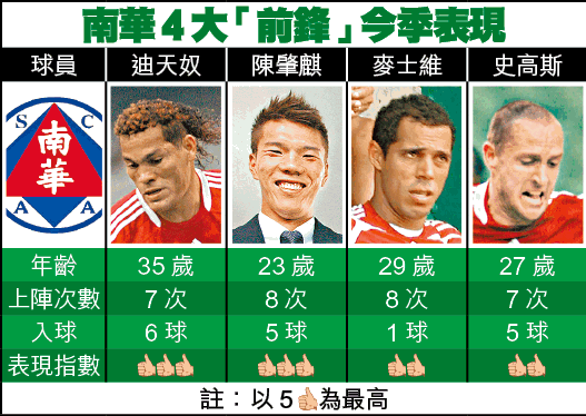南華前鋒線有廸天奴、史高斯、麥士維及陳肇麒4大前鋒,號稱擁有最強勁的攻擊
