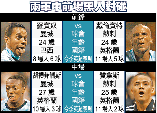 黑人球員在英超影響力越來越大,今仗兩軍中前場皆有重要「黑棋」;熱刺射手戴倫賓特和曼城前鋒羅賓奴,將正面交鋒一分高下。