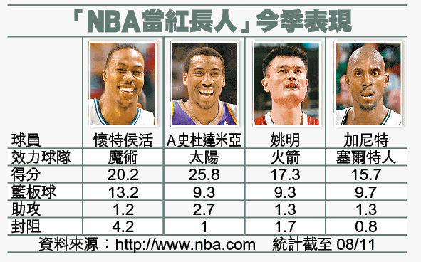 現役NBA「長人」中,中國中鋒姚明亦同錄得6次「30+15+3」,太陽的A史杜達米亞亦有4次,塞爾特人的加尼特則有兩次。但是罰球仍是懷特侯活的「死穴」,皆因他職業生涯罰球命中率只有60%,今季的命中率更不足50%;而姚明及A史杜達米亞今季的罰球命中率分別為94%及86%,如果懷特侯活要成為「NBA最佳長人」,則要多多練習提高罰球命中率了。