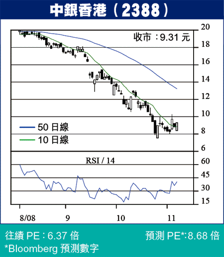 要更改強積金制度其實並不合適,同時亦不合理,但相反暫停基金投資,似乎是一件非常容易的事情,尤其是「雷曼事件」後。不過,我仍然覺得,在調動投資資金上,投資者應該分散在不同渠道上,所以基金的投資,實不應過於輕率放棄,只要認清基金的內容便可,但同時間要本地投資者重拾信心,其實並不容易,所以本地銀行股如中銀香港(2388)、大新金融(440)、創銀(1111)等的非利息收入將會下降,加上利息收入難以看好下,短期走勢將繼續較大市疲弱。
