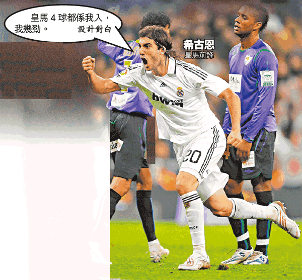 至於巴塞死敵皇馬,同日亦有球員獨取4球。代替受傷的雲尼斯達萊打正箭頭的希古恩,上、下半場各入兩球,協助半場有後衞沙治奧拉莫斯領紅被逐的皇馬,於3度落下反勝來訪的馬拉加4:3,開出10倍「主其他」波膽,不過[-1]的「主勝」卻泡湯。連同這場比賽,他們於今季西甲已開出了3次「主其他」波膽(主勝紐文西亞4:3及主勝希杭7:1),與巴塞一樣常演入球騷。
