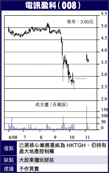 6月底,電盈每股賬面資產淨值只是0.27元,私有化價4.20元相當於資產淨值溢價14.5倍,溢價極高,但不能作準。電盈已作重組,將地產以外業務組成HKTGH,且曾招標出售其中45%,礙於經濟形勢惡化,未能成事。當時市場對HKTGH的估值在300億元之下,連同應佔盈大地產(432)權益61.53%,賬面值48.6億元,即每股電盈應值5.15元,私有化代價折讓18.4%。