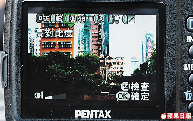 雖然K-m屬於單鏡反光相機,不過內置好多儍瓜機功能,例如場景拍攝模式當然唔少得,不過K-m最值得玩都係內置數碼濾光鏡,一共有14種之多,當中包括暗角、水彩、粉彩風格及復古淡色菲林等。