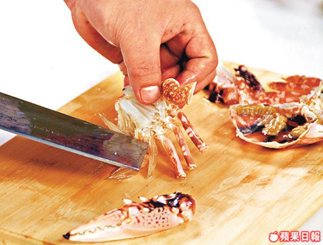 2.將蟹起蓋,切走蓋邊,以免食時𠝹嘴。再將蟹身一開二斬開,清走內臟,冲洗亁淨。