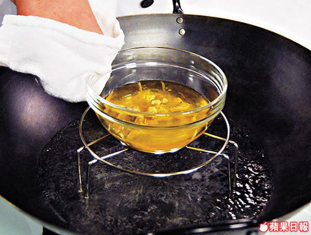 1.燒滾一煲水,將雞油膏隔水蒸半小時,隔走渣,舀起浮面的黃油備用。