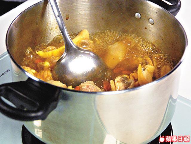 1.將雞湯倒入鍋,下北芪、黨參、桂圓肉、杞子、當歸、淮山及果皮,開大火煲滾,滾起後轉細火煲約45分鐘。