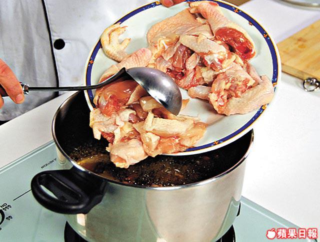 2.加入花雕酒及冰糖,開大火煮滾,下雞件,冚蓋再煮3分鐘。