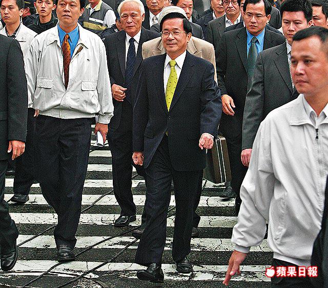 昨日上午9時30分,為陳水扁第五度到特偵組接受問訊的時間。約8時40分,扁在綠營立委葉宜津、賴清德、高志鵬等人陪同下,棄車不坐,在國安人員和警員保護下,由辦公室步行前往50米之外的特偵組。刻意繫一條螢光綠色領帶的阿扁,也許意識到自由將失,其間不停向周圍民眾揮手,在特偵組門口,他停下腳步,向守候的媒體發表演講。扁開口先用台語和客家語向大家問安,只見阿扁神色凝重、臉色蒼白。