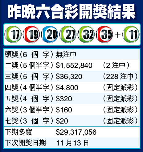 昨晚攪出號碼包括:17、19、20、27、32、35,特別號碼11,投注額高達7,169萬元。雖然頭獎無人中,但二獎有兩注中,每人獲派155萬元。