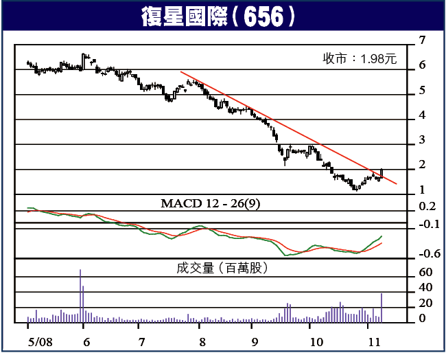 復星去年7月上市時售價9.23元,上市後最高成15元,上月底跌到1.13元才回升,同高位比足足跌咗92.4%,就算同上市價比亦唔見咗87.7%,以一家咁大型嘅綜合企業而言,着實跌得過份,近日股價由低位回升,在1.87至1.52元間略作整固後,噚日破位而上,且有大成交支持,有力升破保歷加通道阻力,向2.80至3元目標推進。